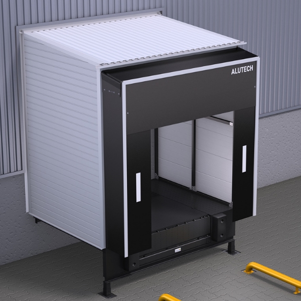 Главная / Перегрузочное оборудование / Перегрузочные тамбуры / Перегрузочный тамбур Alutech DH (30 градусов, заполнение сэндвич-панель)